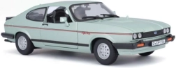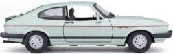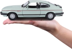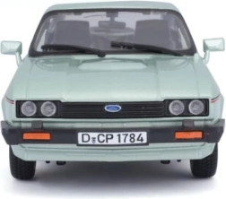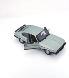 Fém modell Ford Capri 1982 1:24 méretarányban, elegáns világoszöld színben. Ideális gyűjtők és klasszikus autó szerelmesei számára autentikus kidolgozásával és részleteivel.