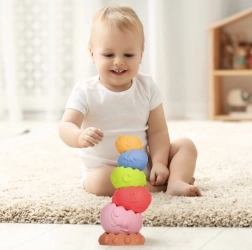 A pasztell elemek könnyen megfoghatók, és stabilan egymásra rakhatók magas toronnyá. A gyerekek minden piramisépítésnél gyakorolják a kéz–szem koordinációt és a türelmet.