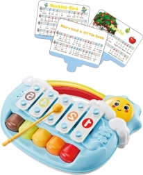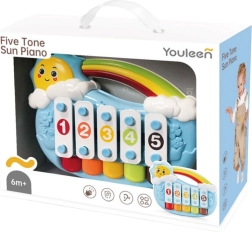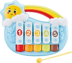 A mosolygós napocska alakú, aranyos kis zongora 5 hangot kínál, amelyeket a gyerekek egy finom koppintással könnyedén megszólaltathatnak. 6 hónapos kortól támogatja az érzékszervek fejlődését, a finommotorikát és a ritmusérzéket. Tartozék 3 dallap, a színes kivitel felkelti a figyelmet, a lekerekített élekkel ellátott, biztonságos kidolgozás pedig ideális a legkisebbeknek. A praktikus fogantyú megkönnyíti a hordozást otthon és útközben is.