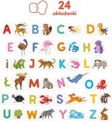 Kezdjétek el a tanulás kalandját! Ez az oktató készlet 24 nagy, két részből álló puzzle-t tartalmaz, amelyek az ábécé minden betűjéhez aranyos állatokat mutatnak be (minden elem feliratozott!), valamint egy ötletekkel teli játékkalauzt. A kirakózás remek módja a betűk megtanulásának és az olvasás-írás útjának kezdetének. Kiemelkedő tulajdonság: A puzzle szórakoztat és tanít.
