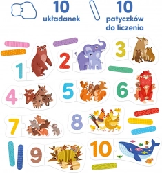 Fedezze fel az óvodásoknak szánt szórakoztató oktatási szettet: 10 nagy, kétdarabos puzzle és színes számolópálcikák segítenek a gyerekeknek megismerkedni a számokkal és megtanulni 10-ig számolni. Szórakoztatva tanító puzzle, amelyek fejlesztik a finommotorikát, a figyelmet és a logikus gondolkodást, valamint motiválnak a matematika első lépéseire.