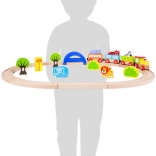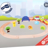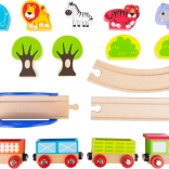 Ovális sínpálya, híd, fák, bokrok, ZOO tábla és állatfigurák – minden egy csomagban a gazdag, képzeletbeli játékhoz.