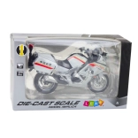 Fedezze fel a részletgazdag motorkamodellt fehér színben piros–sárga vonalakkal, amely hűen adja vissza a modern egy nyomvonalú gépek dinamikáját. A fém váz és a minőségi műanyag kombinációja hosszú élettartamot garantál, míg az olyan valósághű elemek, mint a tükrök és a fényszórók, autentikus megjelenést kölcsönöznek a modellnek.