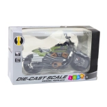 Ez a precízen kidolgozott 1:12 méretarányú chopper modell fém vázzal és masszív műanyag elemekkel készül a hosszú élettartam és az autentikus megjelenés érdekében. A fekete kivitel zöld részletekkel markáns karaktert ad a motorkerékpárnak, amely bármely gyűjteményben vagy stílusos dekorációként is figyelemfelkeltő.
