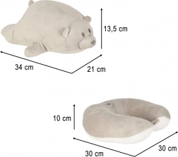 Ez a praktikus 2 az 1-ben utazópárna ideális gyerekeknek és felnőtteknek, akik kényelmet és nyugalmat keresnek utazás közben. A párna könnyedén aranyos plüss mackóvá alakítható, amivel öröm összebújni. Kiváló támaszt nyújt a nyaknak és fejnek az ergonómiai formának és könnyű polisztirol gyöngy tölteléknek köszönhetően.