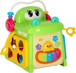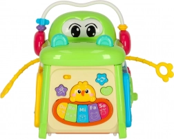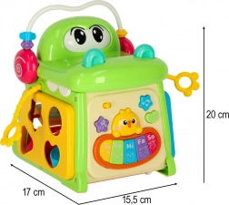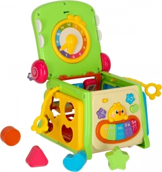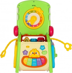 Ez az okos és biztonságos játék természetes módon támogatja a gyermeki fejlődést. Játék közben a kicsik finommotorikájukat, logikus gondolkodásukat és a kéz–szem koordinációt gyakorolják, miközben formákat illesztenek be, gombokat nyomnak, elemeket forgatnak, és figyelik a zongora fény- és hanghatásait. A lekerekített élek és a praktikus fogantyú kifejezetten a kis kezekhez igazodik.