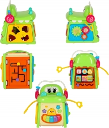 A kocka 18 hónapos kortól ajánlott. A kerekeknek köszönhetően könnyen hordozható és mozgatható, így otthon és utazás közben is szórakoztat. A színes kivitel és a változatos tevékenységek fenntartják a gyermek figyelmét, támogatva a szenzoros stimulációt és a játékon keresztüli tanulást.