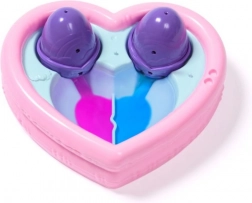 Helyezd a tojásokat a szív alakú medencébe, vedd le a szárnyacskákat, és lassan önts vizet. Amint a szív mindkét fele színt vált, a figurák kikelnek. Több víz hozzáadásával az árnyalatok lilává olvadnak össze a még nagyobb wow-hatásért.