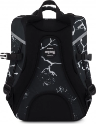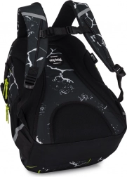 A hátizsák elegáns megjelenése fehér absztrakt mintákkal és zöld részletekkel minden iskolás figyelmét felkelti.