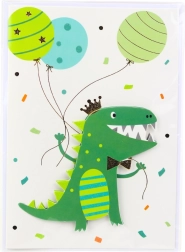 Az unikornis, dinoszaurusz, elefánt és béka vidám mintái játékos és vidám hangulatot kölcsönöznek a kártyának.