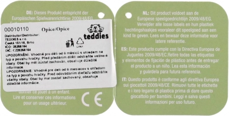 A hímzett szemek és mosoly, apró alkatrészek nélkül, alkalmassá teszik 0m+ babák számára.