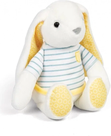 Aranyos és puha plüss nyuszi hosszú fülekkel, kék csíkos pólóval és sárga mintás talpakkal – ideális játszótárs és alvótárs. GRS tanúsítvánnyal rendelkező újrahasznosított anyagokból készült, megfelel az európai biztonsági előírásoknak, és újszülött kortól alkalmas.