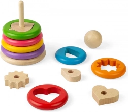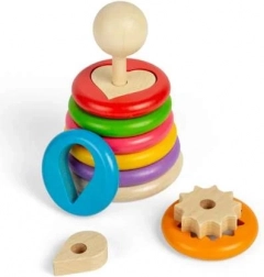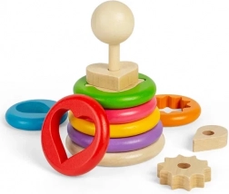 Ez az eredeti rakosgatós játék hét fa karikát tartalmaz, amelyek mindegyike más alakzatot rejt – például szívet, csillagot, levelet vagy fogaskereket. A gyerekek először a megfelelő alakzatot illesztik a karikába, majd az egész elemet a fa pálcára fűzik. Szórakoztató módja a formák, méretek és térbeli észlelés megértésének.