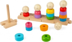 Ez a fa rakosgató készlet játékos felfedezést kínál a gyerekeknek. Az öt különálló pálca a puzzle talpon lehetővé teszi különféle figurák építését színes gyűrűkből és arcokkal ellátott fejekből. A cserélhető elemeknek köszönhetően a gyerekek felfedezhetik a formákat, színeket és sorrendeket, miközben türelmet és logikus gondolkodást gyakorolnak.
