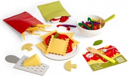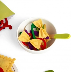 Ezzel a sokoldalú készlettel a gyerekek kis séfnek érezhetik magukat, és elkészíthetik saját tésztás tányérjukat. A színes, puha filc összetevőket – tagliatelle, ravioli és farfalle – paradicsomszósz, gomba, bazsalikomlevelek, valamint fa tál, tányér, két villa és reszelő parmezándarabbal egészíti ki – minden megvan a valósághű konyhai mókához.