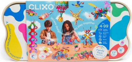 A CLIXO Family Party nagy készlet az egész családnak és csoportos játékhoz. A szabadalmaztatott, 360°-ban forgó és 24 pozícióban rögzíthető mágneses rendszernek köszönhetően az alkotások stabilan tartanak. A rugalmas, többirányú elemekből könnyedén építhetsz 2D és 3D modelleket – állatokat, járműveket, építményeket és tudományos projekteket.
