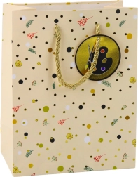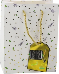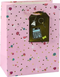 Különleges iskolai alkalmakra készült ajándéktáska modern mintával, iskolai motívumok által inspirálva, amelyek felkeltik a figyelmet és egyedülálló karaktert adnak az ajándéknak. Minőségi díszítő kartonból készült, amely biztosítja a tartósságot és az esztétikát a nehezebb tárgyak szállításánál is. Az arany zsinóros fogantyúk kényelmet és biztonságos szállítást biztosítanak.