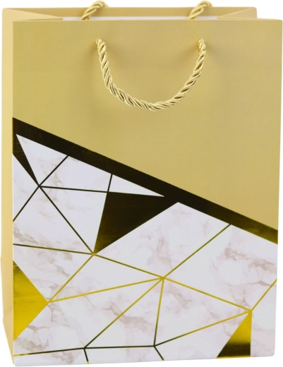 Elegáns ajándék táska modern dizájnnal tökéletes választás minden alkalomra – szülinapoktól és évfordulóktól kezdve esküvőkön és társasági eseményeken át. Kiváló minőségű díszítőkartonból készült, kiemelkedik a geometriai minták stílusos kombinációjával márványhatással és arany vonalakkal. Ezek az metálfényű arany vonalak luxus jelleggel ruházzák fel a táskát, elegáns ajándékcsomagolássá téve.