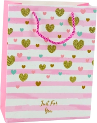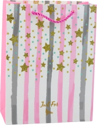 Az ajándéktáskák kényelmes zsinóros fogantyúkkal vannak ellátva rózsaszín és kék színekben, ami könnyű szállítást tesz lehetővé. Minden táska csillogó motívumokkal díszített, mint például csillagok, szívek, rombuszok és arany pöttyök, amelyek eleganciát és sikket kölcsönöznek.