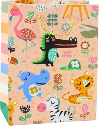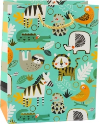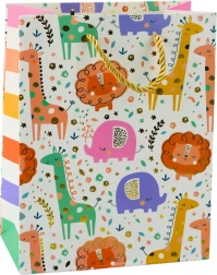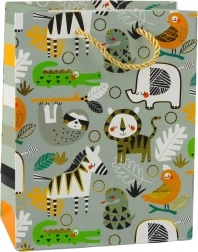 Ez a papírtáska szafari állatok motívumával varázslatot ad az ajándékaihoz. Minden táskában erős és színes kivitelezés található, amely mindenki figyelmét felkelti. Erős fogantyúk biztosítják a kényelmes hordozást, míg a vonzó minták tele boldog állatokkal elbűvölik mind a gyerekeket, mind a felnőtteket.