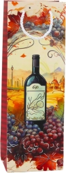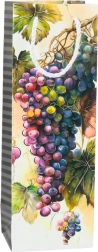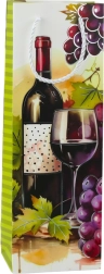 Színes motívumok boros palackokkal és szőlőfürtökkel elegáns megjelenést kölcsönöznek a zacskónak.