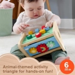 A különféle tevékenységek izgalomba hozzák a gyerekeket, amelyeket a Fa aktív háromszög Fisher-Price kínál. Ez a masszív és oktató háromszög főképp fából készült, néhány műanyag elemmel. Kétoldalas panelt tartalmaz állatokkal és interaktív elemekkel, mint például csúsztatható gombok, forgó fogaskerekek, és három forma, amelyek forognak a háromszög spirális tengelye körül.
