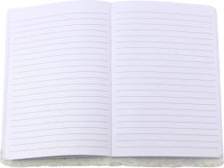A jegyzetfüzet vonalas lapokkal rendelkezik, amelyek megkönnyítik a mindennapi jegyzetek készítését, napló vezetését vagy skiccek készítését. Méreteinek köszönhetően, 22 x 16 x 3 cm, kényelmesen szállítható, és elfér egy hátizsákban, kézitáskában vagy iskolai tolltartóban. A puha plüss textúra a jegyzetfüzet kézben tartását igazi élvezetté teszi.