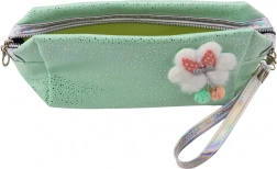 Ez az univerzális neszesszer a finom mentazöld színben játékos dizájnt ötvöz praktikus részletekkel. A csillogó szemcsék elegáns csavart adnak, míg az elülső bolyhos masnis felhő és a színes pomponok kiemelik a cuki stílust.