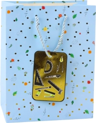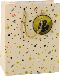 Ez az ajándéktáska ötvözi az elegáns dizájnt és a praktikus tartósságot. Finom pöttyök, virág- és levélminták egészülnek ki fényes arany részletekkel és mellékelt címkével, mely könyvek, számológép vagy festőpaletta motívummal díszített. 32 × 26 × 12 cm-es méretének köszönhetően kényelmesen elférnek benne a kisebb és közepes méretű ajándékok.