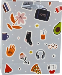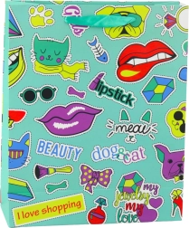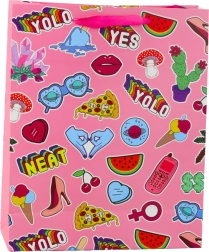 Egyedi ajándéktáska színes matricákkal és divatos feliratokkal – már első pillantásra magára vonja a figyelmet. Az élénk színek és trendi dizájn remek kiegészítővé teszik fiatalok és felnőttek ajándékaihoz. A 32 × 26 × 12 cm-es méretnek köszönhetően kényelmesen elférnek benne a kisebb és közepes méretű ajándékok.