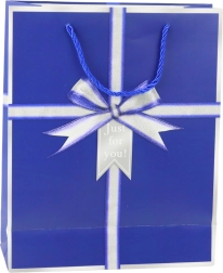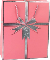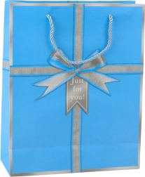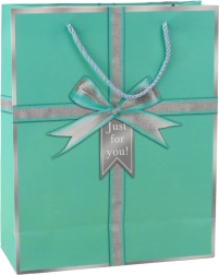 Elegáns ajándéktáska ezüst masni motívummal és „Just for you!” felirattal, amely minden ajándéknak stílusos megjelenést kölcsönöz. Minőségi díszkartonból készült, erős zsinórfülekkel rendelkezik, és univerzális 32 × 26 × 12 cm mérete kisebb és közepes ajándékokhoz is ideális. 4 elegáns színben elérhető – kék, zöld, rózsaszín és világoskék.