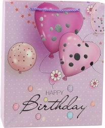 A Happy Birthday felirattal és vidám lufimotívummal díszített ajándéktáska remek választás bármely születésnapra. A rózsaszín, kék, lila és barack árnyalatú, látványos dizájnt praktikus kivitel egészíti ki, amely a nehezebb ajándékokat is biztonságosan tartja.