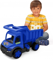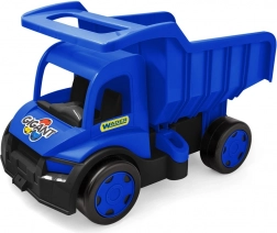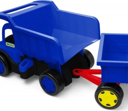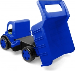 Robusztus gyerek billenőplatós GIGANT teherautó sötétkék színben, 55 cm hosszban, amely örömet szerez a kis építőknek otthon és a szabadban is. Nyitható billenő platója praktikus fogantyúval, két vonószemmel elöl és hátul utánfutó csatlakoztatásához vagy vontatáshoz, valamint kiemelkedően tartós felépítéssel akár 150 kg teherbírással rendelkezik.
