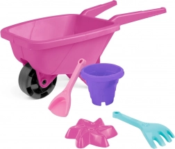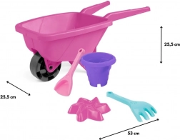 Gyermek rózsaszín talicska 4 részes homokozókészlettel – remek választás kerti, játszótéri és tengerparti játékhoz. Tartalmaz egy kompakt, könnyű talicskát és egy homokozó szettet: 1 l-es vár formájú vödröt, formázót, lapátot és gereblyét. Az ergonomikus markolatok megkönnyítik a kormányzást és segítik az egyensúly megtartását. Tartós, biztonságos anyagból készült, különféle időjárási körülményekhez alkalmas.
