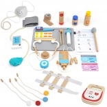 Hordágy állvánnyal, orvosi fiolák és maszk, betegkártyák, spatula, csipesz, rögzítősín és még sok más a valósághű játékhoz.