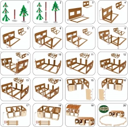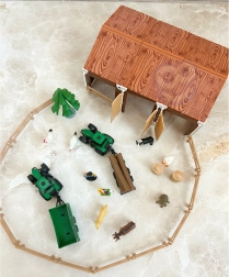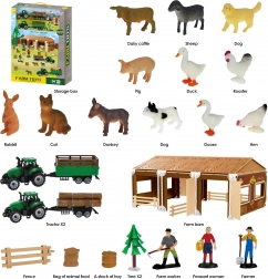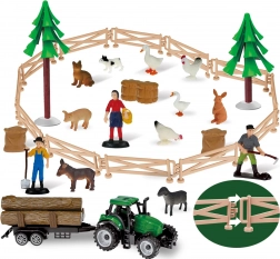 - 12 állatfigura, 3 emberfigura, 2 traktor levehető pótkocsikkal, pajta/zagroda, karámok és további farmkiegészítők
