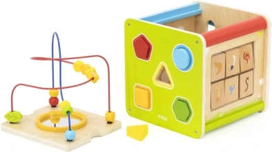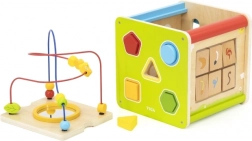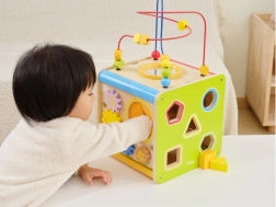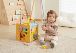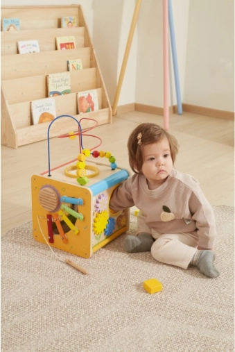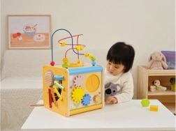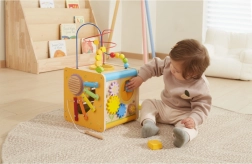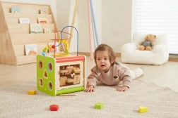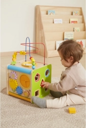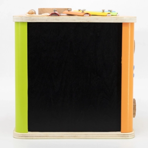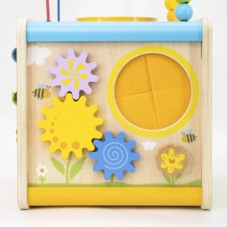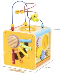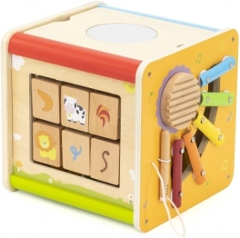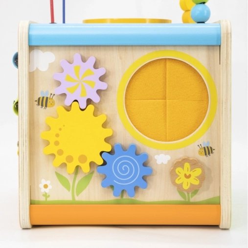 Fedezze fel a színek, formák és hangok világát ezzel a fa 5 az 1-ben oktatókockával. Tartalmaz gyöngylabirintust, formabedobót, fogaskerekeket, mozgatható mutatós órát és zenei panelt xilofonnal. A stabil fa szerkezet, a élénk színek és az átgondolt részletek fejlesztik a finommotorikát, a kéz–szem koordinációt, a logikus gondolkodást és a kreativitást kb. 18 hónapos kortól.