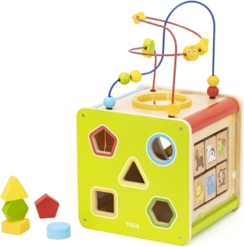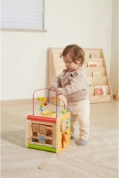 A tömör fa és a simára csiszolt élek biztonságos használatot garantálnak, miközben a telt színek és a szórakoztató mechanizmusok hosszú időre lekötik a kis felfedezők figyelmét. A kocka remek választás önálló játékhoz és közös pillanatokhoz a szülőkkel.