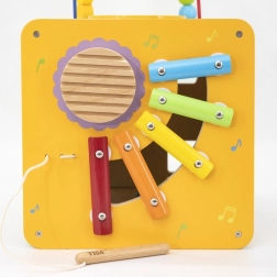A felső oldalon található színes drótlabirintus erősíti a fogást, fejleszti a kéz–szem koordinációt, és türelemre valamint összpontosításra tanít.