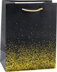 Elérhető négy színváltozatban: sárga, lila, piros és türkiz. Minden szín fekete háttérrel egészül ki, amely kiemeli az eleganciát és a kontrasztot a csillogó hatással. Erős zsinóros pántok, amelyek színben harmonizálnak a színátmenettel, biztosítják a kényelmes szállítást, és a stabil konstrukció garantálja a biztonságos tárolást még nehezebb ajándékok esetén is.