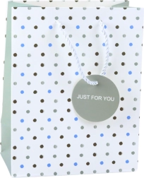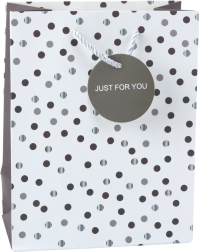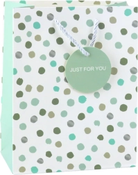 Ajándéktáska pöttyökkel ideális megoldás ajándékok csomagolására bármely alkalomra. Kiváló minőségű díszítő kartonból készült, finom pöttyös mintával ezüst, zöld és fekete árnyalatokban, modern és stílusos megjelenést biztosít. Ajánlott születésnapokra, évfordulókra és más ünnepi eseményekre.