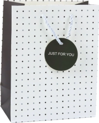 Minden táska elülső oldalán található egy dekoratív címke 'Just For You' felirattal, amely hangsúlyozza az ajándék egyediségét és eleganciát kölcsönöz az összképnek. Az erős kötélfogantyúk, amelyek színben illeszkednek a motívumhoz, kényelmes szállítást biztosítanak.