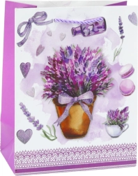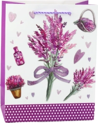 A táska kiváló minőségű dekoratív kartonból készült, amely biztosítja tartósságát és esztétikus megjelenését gyakori használat során is. Levendula minta csillogó akcentusokkal és lila elemekkel kombinálva bájt és eleganciát kölcsönöz az egésznek. A stabil lila zsinóros fogantyúk kényelmes hordozást biztosítanak, a robusztus konstrukció pedig lehetővé teszi kisebb és közepes ajándékok biztonságos csomagolását.