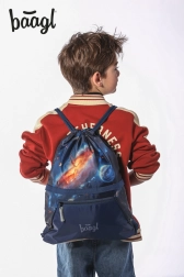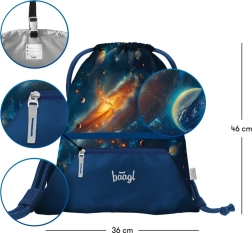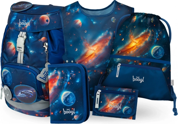Készüljön fel az iskolára egy teljes űr témájú iskolai készlettel. Ez a készlet hátizsákot, tolltartót, cipőzsákot, művészeti kötényt és praktikus pénztárcát tartalmaz, mindezt bolygókkal és galaxisokkal díszítve kék alapon.