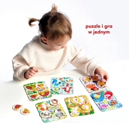 Fedezze fel a vidám gyerekpuzzlet, amely egyben az első egyszerű játék is. A csomagban 6 darab négyrészes kirakó található állatfigurákkal és 12 kerek zseton párosításhoz. Ideális a finommotorika, az észlelés és a türelem fejlesztésére – majd jöhet az első társasjáték az elkészült képekből!