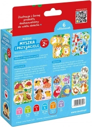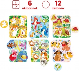 Cuki illusztrációk kedvelt házi kedvencekről – egerekről, kutyákról, halacskákról, hörcsögökről, teknősökről és hullámos papagájokról – hívogatnak kirakásra és első játékra. Először a gyerekek kirakják a 6 darab négyrészes jelenetet, majd hozzájuk párosítanak 2 tematikus zsetont, és a puzzle-ből egyszerű észlelési és párosító játék lesz.