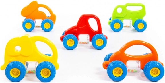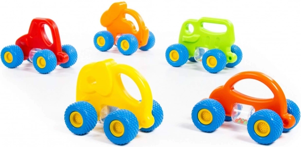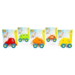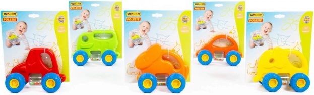 A bájos, nyusziformájú kisautó a legkisebbek biztonságos és fejlesztő játékához készült. A durva mintázatú gumikerekeknek köszönhetően a haladás csendes és egyenletes különböző felületeken. A színes golyókkal töltött henger mozgás közben kellemesen csörög, fejlesztve a hallási észlelést.
