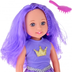 Gyönyörű baba hosszú lila hajjal, ideális ajándék minden kislány számára, aki szeret hajat formázni és babázni. A hozzá tartozó rózsaszín kefével fésülhet és gyönyörű frizurákat készíthet.