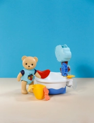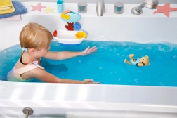A Teddy maci lekerekített formái biztonságosak a legkisebbek számára, könnyen megfogható és remekül úszik. A színes elemek fejlesztik a finommotorikát, az érzékelést és a logikát a vízáramlás felfedezése közben.
