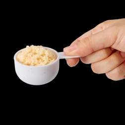 Masszív műanyag pohár ergonomikus füllel és mércejelölésekkel, amely segít a mennyiségek becslésében. A spatula támogatja a keverést és a tálalást.